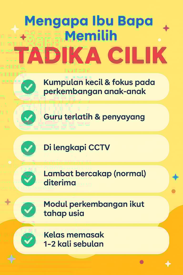 Dengan banyaknya pilihan tadika, yang paling penting ialah perhatian dan perkembangan anak. Di Tadika Cilik, setiap anak diberi tumpuan khas oleh guru yang faham keperluan mereka. Inilah yang membuatkan kami berbeza.