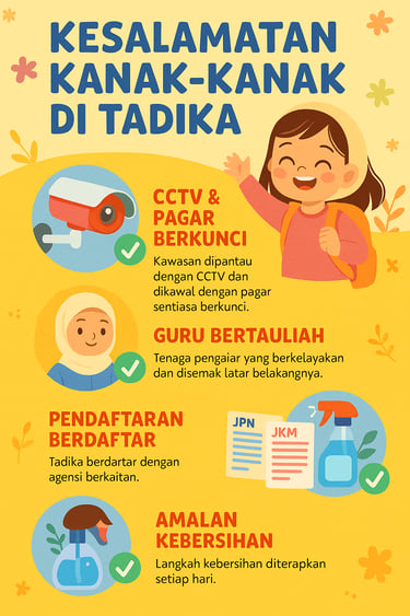 Kami pantau setiap sudut tadika dengan CCTV aktif, dan pintu pagar sentiasa dikunci dari dalam demi keselamatan anak anda sepanjang hari.