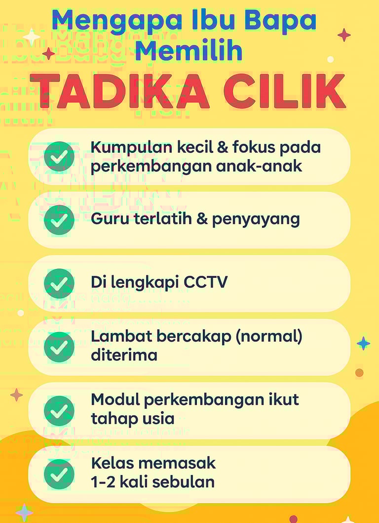 Dengan banyaknya pilihan tadika, yang paling penting ialah perhatian dan perkembangan anak. Di Tadika Cilik, setiap anak diberi tumpuan khas oleh guru yang faham keperluan mereka. Inilah yang membuatkan kami berbeza.