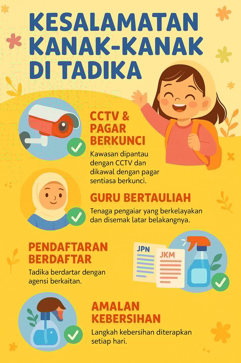 Kami amalkan standard kebersihan tinggi setiap hari – pembersihan rutin, sanitasi ruang kelas & tandas, serta pemeriksaan kesihatan asas untuk anak-anak.